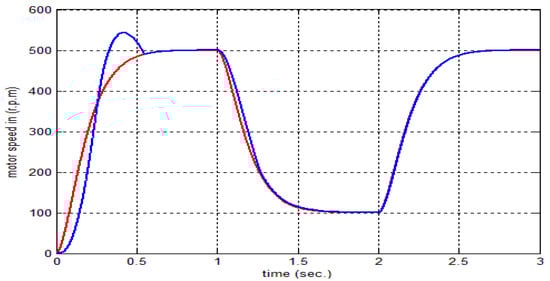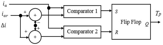 This approach consists of two control loops: an outer loop representing the speed controller and an inner loop representing the current controller. A controller is utilized to obtain the control signal by comparing the motor speed to the intended speed to establish the motor’s desired reference armature current. The armature current sought by the motor will influence any change in motor speed. Hysteresis current controller (HCC) is utilized in the inner loop to control the current by comparing the motor current with the desired current and generating the switching control signal for the DC–DC converter (chopper). The armature current in an HCC is forced to stay within the hysteresis band defined by the upper and lower hysteresis limits [14]. The achievement of this method is shown in Figure 3. The pulse width modulation controller depends on the chopping frequency, which can be variable or constant [18].