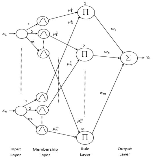 The mean and standard deviation of the Gaussian function are denoted by and (i = 1, 2, …, n; j = 1, 2, …, m) in the term of the input linguistic variable to the node of this layer, respectively.