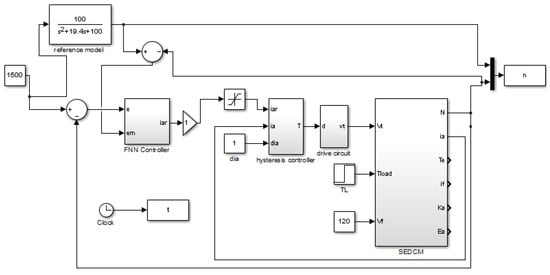In nonlinear systems, the control parameters should be tuned and adapted to obtain excellent performance [19]. Several algorithms are applied using a reference model to achieve good performance for the closed-loop controller [27,28]. The controller is designed in such a way that the measured output of the plant corresponds to the desired output of the reference model. Figure 6 displays a block schematic of the SEDCM speed control utilizing the proposed FNMR with online tuning. Accordingly, The suggested controller’s parameters are tuned using a gradient descent-based back-propagation technique.
