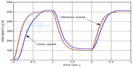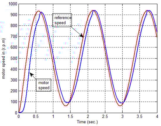 The proposed system has been tested at 10 and 100 epochs. The result presents that the motor speed follows the reference speed by increasing the number of epochs. Accordingly, the error is near zero. If the reference speed input has a sinusoidal shape, then the rotor speed response at 10 epochs is well tracked by the reference model, as demonstrated in Figure 11. Figure 12 shows the rotor speed at 100 epochs. Therefore, the rotor speeds are matched together, and this is the goal of the proposed controller.