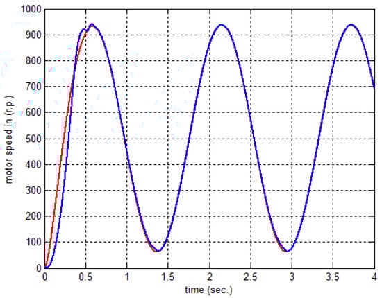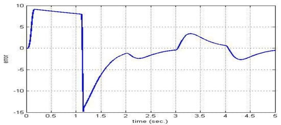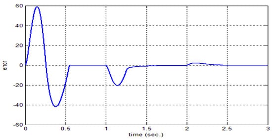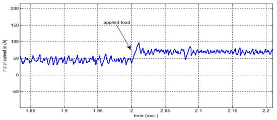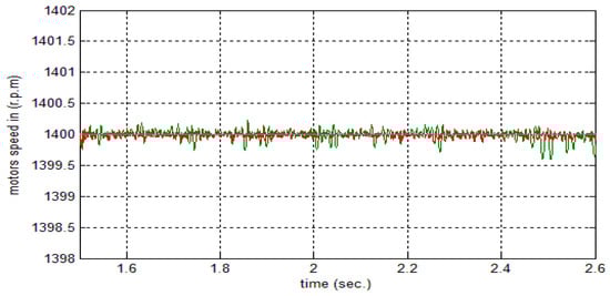 Figure 18 depicts the armature current for the applied load at a time of . The response of the two motors connected in the master–slave scheme when applying an FNMRC controller is depicts in Figure 19. As seen in this figure, the slave has been synchronized with the master according to the reference trajectory. Figure 20 shows the error between the master motor speed and the slave motor speed when applying an FNMRC controller. The error is considerably small, indicating the synchronization between the two speeds. When the load disturbances (25 N∙m) at 1400 rpm speed is applied to the motors at , the sequential and synchronization of the two motors is not affected by this disturbance, as seen in Figure 21.