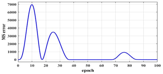 The square function is used to test the system performance. The system responses for 10 and 100 epochs are depict in Figure 13 and Figure 14, respectively. Figure 15 reports the error values between the model reference and the speed of the motor at 100 epochs. A small error between the speeds is obtained, and this explains the aim of the proposed controller. Figure 16 reports the speed of the motor at 1500 rpm for the load torque of 25 N∙m at . Figure 17 show the relationship between the cost function and epochs.