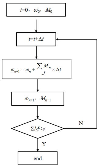 The interface between PAT impeller and volute or outlet pipe is definite, that is, there are two overlapping surfaces at the interface. The Fluent sliding mesh model allows us to create a problem where different regions move relative to each other, so the sliding mesh can be used instead of dynamic mesh model for transient calculation. On the basis of ensuring better mesh quality, sliding mesh can avoid negative mesh and save calculation time [26]. The UDF program of PAT passive rotating is written from the rotation equation of rotor and compiled in Fluent, and the torque on the blade is calculated by the Compute_Force_And_Moment function, and the angular speed of rotator is obtained by the rotation equation [25]. The angular speed is transferred into the sliding mesh flow field solver by macro DEFINE_ZONE_MOTION, and the impeller domain mesh is being adjusted dynamically. Starting from ω0 = 0, the angular speed ωn+1 is iterated for each time step. As the time step advances, the resultant torque of the impeller gradually decreases, and the rotating speed gradually approaches the rated speed, so as to complete the start-up process. The simulation process of solving the PAT start-up process is shown in Figure 1.