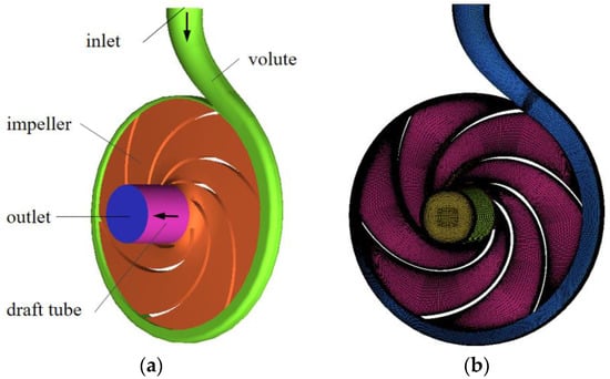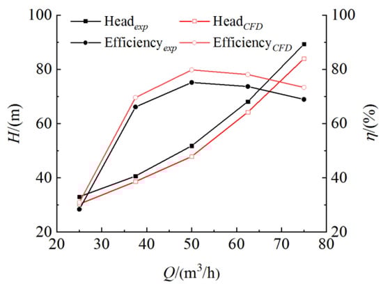 Figure 3 shows the computational domain and meshing of PAT flow field. The flow field calculation domain of the PAT includes three parts: the volute, the impeller and the draft tube. When the pump is used as PAT, the outlet of pump is the inlet of PAT, and the inlet of pump is the outlet of PAT. The fluid enters into the volute at the inlet of PAT and impacts the impeller to rotate. The entire flow domains are generated using PTC Creo software. The hexahedron structured grids are generated with ICEM CFD [26]. Mesh refinement of near-wall and blade head regions is performed, and most of y+ on the wall is less than 50. Different grid scales are used to perform the grid independence analysis corresponding to 7.16 × 105, 1.14 × 106, 1.90 × 106, 2.82 × 106 and 3.66 × 106 nodes. As shown in Figure 4, when the number of grids reaches 1.90 × 106, the relative change in efficiency and head is less than 1.5%. Therefore, 1.90 × 106 is selected as the number of grids for all simulations in this study.