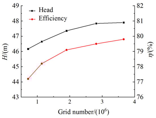 Check of grid independence (the left y axis represents head and the right y axis represents efficiency).