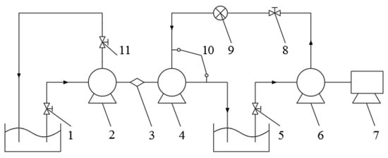 Experiment schematic diagram of PAT. 1, 5. Gate valve; 2. Consume pump; 3. Torque meter; 4. PAT; 6. Feed pump; 7. Motor; 8, 11. Control valve; 9. Flow meter; 10. Pressure transmitter.