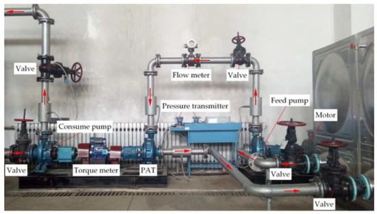 The PAT performance test experimental device is mainly composed of feed pump, PAT, consume pump, water tank, circulation pipeline system and test system. The NC-3 torque meter with measurement accuracy of 0.2 grade is set between PAT and consume pump to measure speed and torque. The LWGY-100 turbine flowmeter with measurement accuracy of 0.5 grade and rated pressure of 1.6 MPa is set in the inlet pipeline of PAT to measure the inlet flow of PAT [28]. The WT-151 pressure transmitter with measurement accuracy of 0.2 grade is set in the inlet and outlet pipeline of PAT to measure the inlet and outlet pressure. The PAT test principle and test rig are shown in Figure 5 and Figure 6.