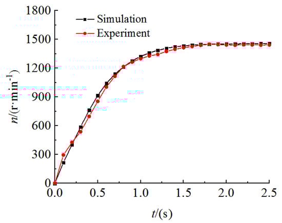 The head and efficiency of PAT at stable operation under different flow rates are tested and compared with the simulation results as shown in Figure 7. The torque and rotating speed signals are collected and processed once every 0.1 s in the start-up process, and the rotating speeds acquired by testing are compared with those by simulation as shown in Figure 8. It can be seen from the diagrams that the simulation results are basically consistent with those of experiments. The hydraulic pulsation characteristics of the turbine are indirectly verified by monitoring the vibration characteristics of the PAT. The FLUKE F802 vibrometer with the accuracy of ±5% is used to measure the horizontal, vertical and axial vibration velocities by setting test points at the base of the PAT pump body, the middle suspension and the bearing box position, respectively. The root mean square of vibration velocity (vu) directly reflects the strength of vibration, which is defined as follows: