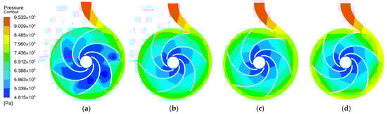 Pressure distributions of axial vertical plane during start-up process. (a) t = 0.5 s; (b) t = 1.0 s; (c) t = 1.5 s; (d) t = 2.0 s.