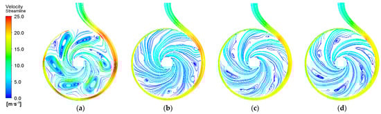 Velocity streamline distributions of axial vertical plane during start-up process. (a) t = 0.5 s; (b) t = 1.0 s; (c) t = 1.5 s; (d) t = 2.0 s.