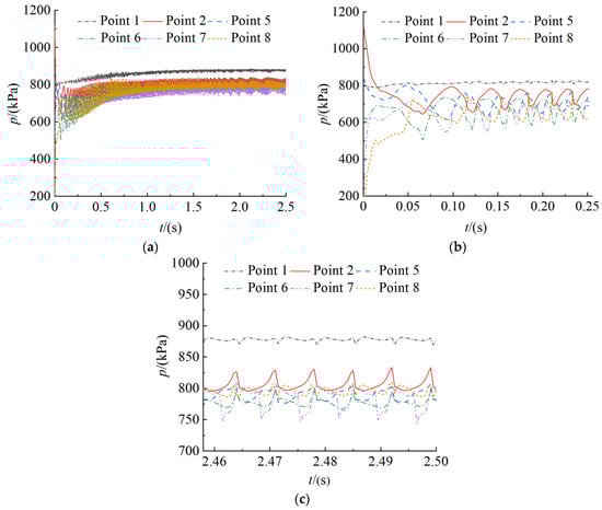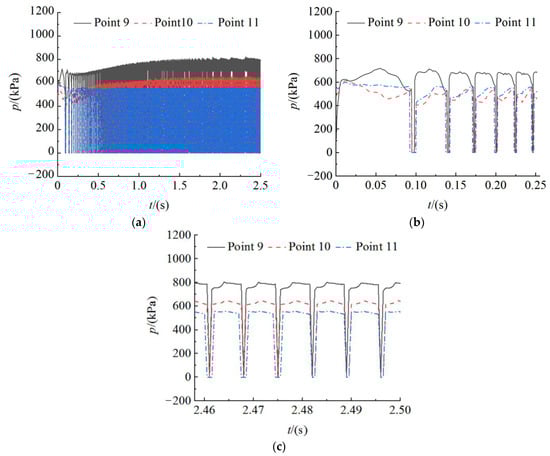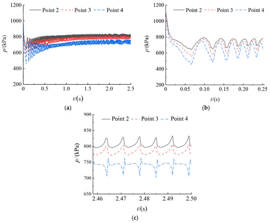 Time domain of pressure fluctuation at volute circumferential location. (a) t = 0~2.5 s; (b) t = 0~0.255 s; (c) t = 2.458~2.5 s.
