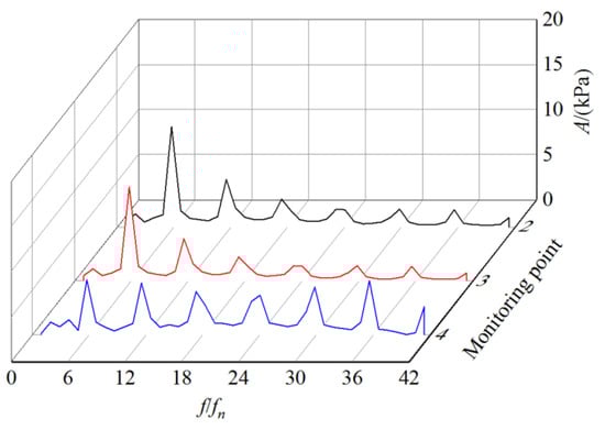 Frequency domain of pressure fluctuation at volute radial location (curves 2, 3 and 4 represent frequency domain curves at monitoring points 2, 3 and 4 respectively).