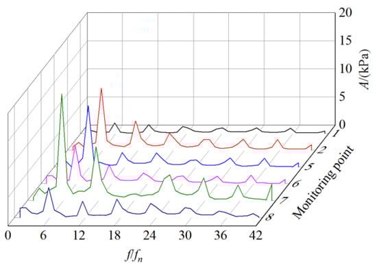 Frequency domain of pressure fluctuation at volute circumferential location (curves 1, 2 5, 6, 7 and 8 represent frequency domain curves at monitoring points1, 2, 5, 6, 7 and 8 respectively).