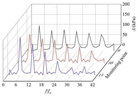 Frequency domain of pressure fluctuation in impeller (curves 9, 10 and 11 represent frequency domain curves at monitoring points 9, 10 and 11 respectively).