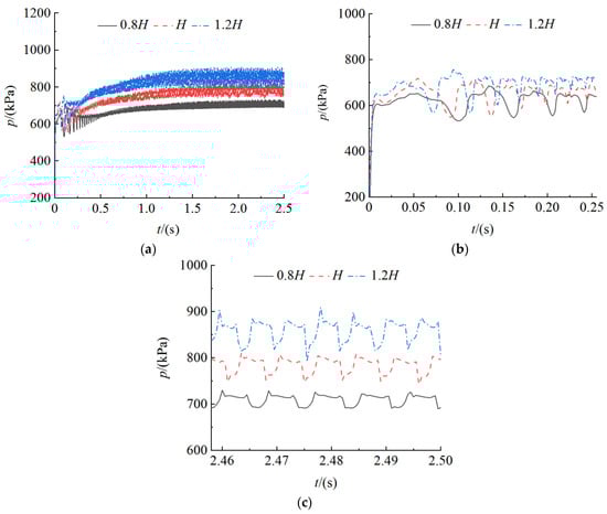 Time domain of pressure fluctuation at various head in volute. (a) t = 0~2.5 s; (b) t = 0~0.255 s; (c) t = 2.458~2.5 s.