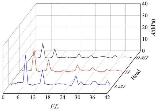 Frequency domain of pressure fluctuation at various head in volute (curves 0.8H, H and 1.2H represent frequency domain curves when the head is 0.8H, H and 1.2H respectively).