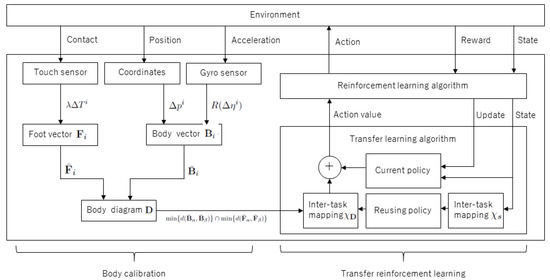 Owing to the declining birth rate, aging population, and declining working population in recent times, intelligent robots will be deployed in the real world in the future. In intelligent robots such as autonomous robots, it is important to realize and implement not only hand-coding rules but also machine learning theory and the corresponding architecture. Among machine learning techniques, reinforcement learning (RL) has been attracting attention as it can actively search for solutions [1,2]. An optimal solution can be found through trial and error based on rewards. However, RL needs to be lengthy or include many trials. Transfer learning (TL) in RL is proposed for solving this problem [3,4]. TL is a method of improving the efficiency of current learning by reusing the knowledge acquired in the past. In TL for RL, the agent of the target task can improve the learning speed and adaptive performance of the target task by reusing the knowledge (e.g., policy, value-function) acquired by the agent of the source task. In the agents of the source task and target task, the effects of the physical composition and behavior on the environment need to be similar. If the agents’ configurations are different (but similar) in the source task and target task, they are described by inter-task mapping.