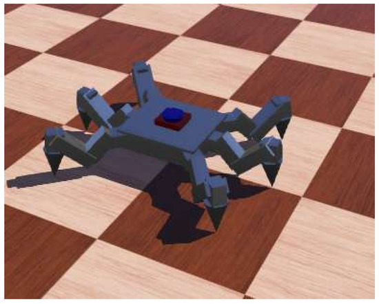 Multi-legged type of virtual agent in Webots. Scales such as for the lengths of the links and the positions of joints and the body are set to be similar to those of an actual robot, as shown in Figure 3. This model is controlled by a Python program in Webots, and information on contact between the ground and the end point of a leg can be obtained in the program.
