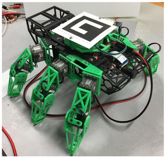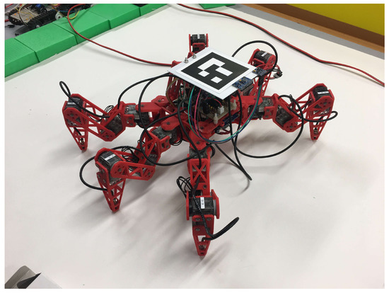 To obtain the self-coordination of the robot, actual robots have a marker on the top of body, as shown in Figure 3 and Figure 5. A camera for recognizing markers was implemented on the ceiling of the experimental environment. The self-position recognition server was installed outside, and the robots can acquire the self-coordinates from the server using a wireless LAN. When the agent and robot are controlled by the RL algorithm, the legs are actuated three legs at a time. For example, legs 1, 3, and 5 in Figure 4 move simultaneously with respect to the command value to rotate the joint. This contributes to a reduction of the action space and a simplification of control.