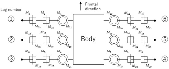 In this experiment, a physical calculation simulator and actual small multi-legged robot were adopted to evaluate the proposed method. Webots was used as a physical calculation simulator [19]. The virtual agent’s body was designed to be multi-legged, as shown in Figure 2. The virtual agent was compatible with the actual multi-legged robots that were developed for this experiment, as shown in Figure 3. The robot in Figure 3 is called Robot 1 hereinafter. The virtual agent and Robot 1 have 18 joints, and each joint is connected by a link, as shown in Figure 4. Obtaining the contact and posture information in the computer simulation is straightforward. However, Robot 1 needs to be equipped with sensors to obtain this information. Therefore, a touch sensor was implemented for the end point of each leg, and a gyro sensor was implemented on the robot’s body. In this configuration, the touch sensor can detect contact between the end point of the leg and the ground as on/off. To detect contact between the body and the ground, a laser distance sensor was implemented under the body.