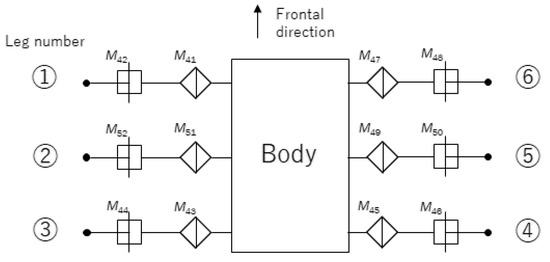 The end point of the leg (toe) of a multi-legged robot has a touch sensor, and the obtained sensor information is given by , which indicates whether the toe has been touched. Here, i is also the number that identifies the type of action. The sensor vector is defined as . Note that the i of the sensor vector is the action number in Equation (6).