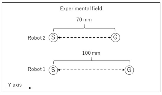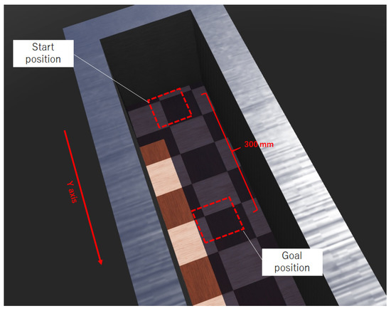 The virtual learning environment in Webots is constructed as shown in Figure 7. The distance between the starting and goal points was 300 mm. A wall was set around the experimental field, as shown in Figure 8, to give a negative reward to the agent. If the agent reached the goal, the agent’s position was automatically reset to the start position. The start position on the y-axis was the same, but the goal position differed depending on the robots, because each robot has a different maximum movement distance for one action. In the case of two robots, the goal position was set as the position reached by the same number of actions. If the robots reached the goal, the robots’ positions were reset to the start position by the human operator.