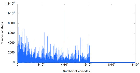 Learning curve obtained from learning simulation with virtual agents. The x-axis denotes the number of episodes, indicating the iteration number of learning. The y-axis denotes the number of steps between the start and goal positions. In other words, the number of steps represents the problem-solving time or number of action selections.