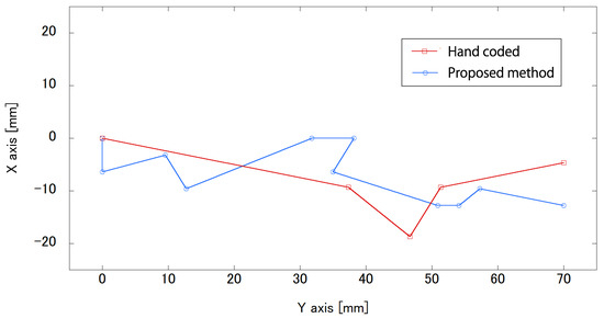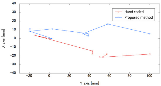For the trajectories of Robot 1, hand-coded conditions are needed to move in four steps from the starting position to the goal. However, the proposed method condition takes 33 steps to move from the starting position to the goal. In other trials, hand coding may require more steps. Both conditions in Figure 10 show that the task of moving forward and reaching the goal was accomplished. In the trajectories of Robot 2, it appears that there is no significant difference in the number of steps between the hand-coded method and the proposed method, and the task of moving forward and reaching the goal was accomplished, as in the experiment with Robot 1.