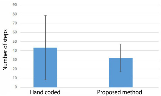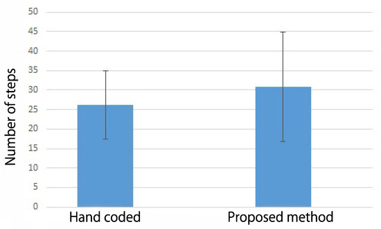 Averaged number of steps and standard deviation over five trials () in Robot 2, for comparison between the proposed and hand-coded methods.