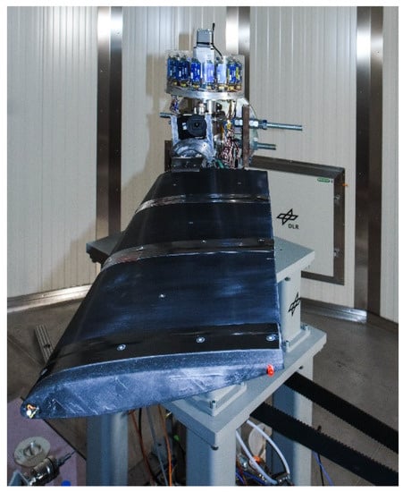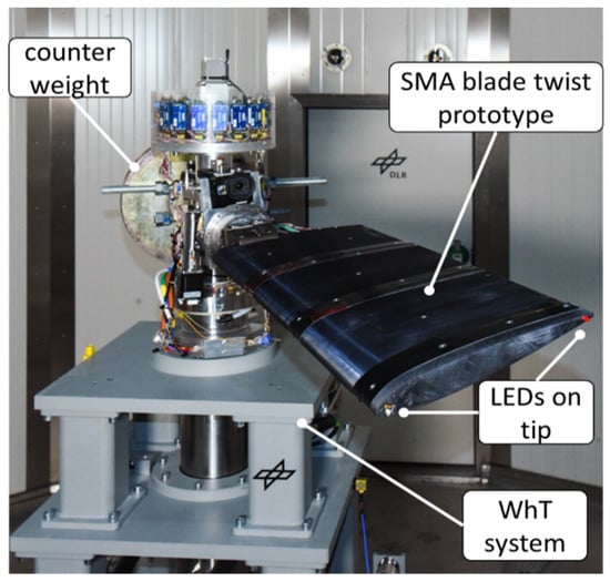 Morphing on rotary wings and in particular on helicopter blades presents specific issues. Indeed, the small size of the blades, jointly to the large deflections and high centrifugal loads, require specific approaches, from the design to the demonstration. The blade modeling with unconventional systems must be addressed with dedicated approaches able to catch the non-linear behavior [,] and the complex interaction between the structure and the external loads []. The demonstration poses specific issues too, from the representation of the operational environment to the measurement of the rotary wing condition. This requires test facilities, such as the whirl tower (WhT) of Deutschen Zentrum für Luft- und Raumfahrt, DLR, specifically conceived for these applications; this facility, used for the activities presented in this work, allows testing of single rotor blades and test articles up to a radius of 2 m under centrifugal loads. Among those investigations that have taken place, one may recall the active twist rotor blades for the Higher Harmonic Control, HHC, with stack actuator developed in []; the active twist rotor blades for HHC using distributed piezo actuation described in the works [,]; the static twist system conceived and investigated in []; the anhedral blade tips, active pitch links tested and described in []; the chord morphing developed for rotor blades in [], and the active tendons for adaptive rotor blade dynamics tested and illustrated in [].