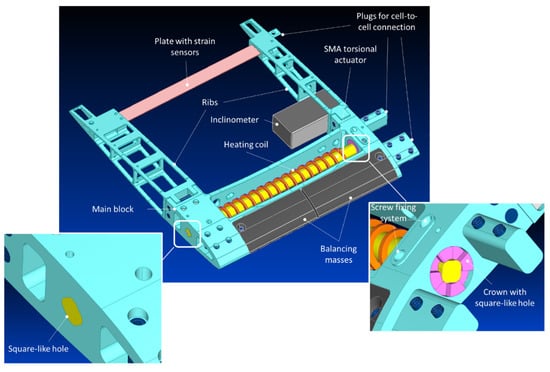 The step-shaped lateral face of the crown is then used for applying torque and thus finalizing the pre-twist of the SMA. The crown is finally fixed to the lateral block through a screw system also highlighted in detail on the bottom right. The just mentioned square-like holes, along with this screw fixing system, assure a correct and efficient transfer of the torsion without any backlash-induced loss of twist, as well as the capability of minimizing stress, thus preventing early failures of the system.