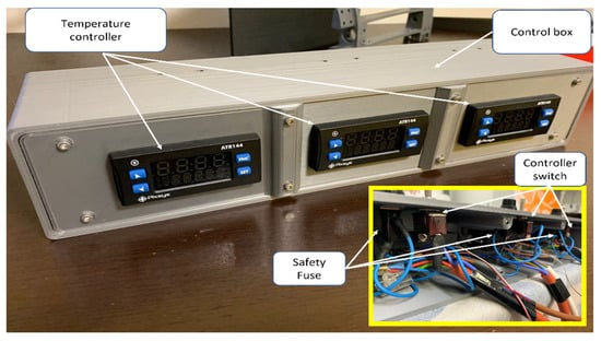 The actuation mechanism requires a temperature control system. It needs to be accurate, reliable, and needs to integrate mechanisms compliant with the safety requirements of the testing facility. To this end, two different actions have been undertaken: designing a control box (Figure 3) to easily set and monitor the temperature, and integrating thermal fuses to prevent any overheating.