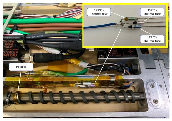 To prevent the abovementioned overheating of the coils, a thermal fuse was also inserted to stop the heating coil if the thermal regulation system fails to acquire the right temperature. Given the complexity of the internal harness configuration, a “3-way” thermal fuse control system has been foreseen (Figure 4). This is because disassembling the whole system to replace a tripped fuse would require more effort than having three different fuses inside the assembled system. If an overheat of the system occurs, the heaters could power using one of the other two available fuses.