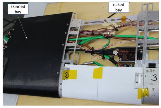 Resistive 120 Ohm strain gages (SG) uniaxial sensors (235SL series, with a gage length of 5.95 mm and a grid width of 2.54 mm) were bonded on the plates located close to the trailing edge of each bay (see Figure 2) using an epoxy resin compliant with the expected range of deformation. For each bay, the strain sensing network was designed to decouple flap and twist effects in terms of strain measurements. To accomplish this task, the supporting plate was pre-sensorized according to the sensor network layout shown in Figure 5. This plate was installed at each bay, clamped on one edge into a rib, and slid on the other edge into the other rib.