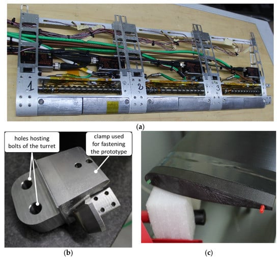 A 3-bay demonstrator interior view (a); WhT connecting flange (b); and tip flange integrated with the LEDS (c).