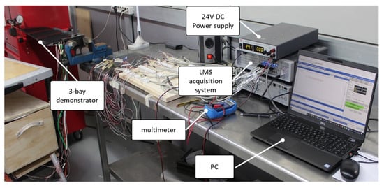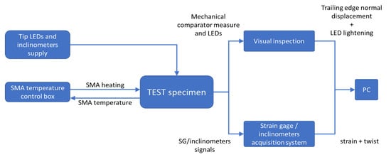 The scope of the laboratory characterization was to verify the functionality of all the subsystems of the prototype before its shipment and installation into the WhT. A dedicated setup was assembled to reproduce the WhT constraint condition, that is to say, the clamp at the root. The block diagram and a picture of the setup are illustrated in Figure 9 and Figure 10. The temperature of the heating coils is regulated by the three independent controllers described in the previous section; they are represented by the block on the bottom left of Figure 9. The other two subsystems, the two LEDs on the tip and the three inclinometers mounted at each bay plus the one at the root are supplied by an external 24 V DC generator (top left block in the picture). The effect of the twist produced by the SMA is then measured by the strain sensors mounted on the supporting plates of each bay, the inclinometer sensors, and a mechanical comparator installed at the free edge of the prototype for visual inspection. The LED functionality is also visually verified. To acquire and elaborate the signals produced by the strain gages and the inclinometers a dedicated acquisition system (Siemens, Munich, Germany LMS SCADAS III) was used.