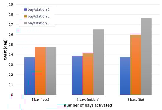 The bars of the front and middle rows (root and middle station, respectively) do not exhibit a clear trend with the number of bays switched on. On the contrary, the bars of the back row show a clear increasing trend. This is presumably due to the fact that the twist occurring at each single bay is practically at the edge of the inclinometer sensor accuracy. Only the geometric amplification occurring at the tip seems enough to outline a clear trend. The cumulative effect of the twist given by all three bays also contributes to the clear increasing trend exhibited by the last bar line on the right. The maximum twist measured at the tip was about 1.1°, over a span of 660 mm, corresponding to a twist of 1.667 °/m, slightly higher than the requirement (8° for a radius of 5 m), which is 1.6 °/m.