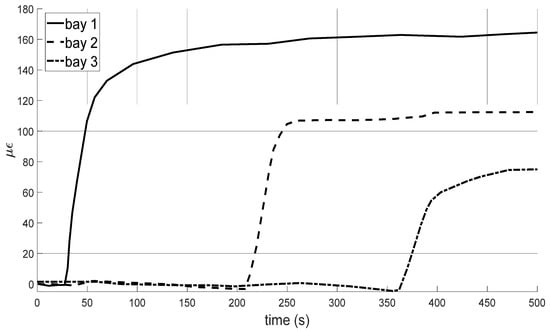 Strain measurements of the SG on the root of the sensored plate of each bay.