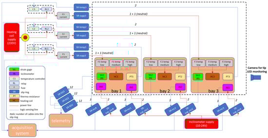 Electrical contacting included the energy supply for the heating coils and blade tip LEDs as well as wiring for strain gauges, temperature sensors, and inclinometers. Temperature control was done by the ATR144 controllers mentioned above, using the temperature signal of the PT element and controlling the current towards the heating coils energy supply by a “switch on and off” logic. The inclinometers and the strain gauges, for the measure of the absolute angles and of the deformation, were connected to the facility through a dedicated slip ring connector cluster. An independent absolute measure of the tip twist was also possible via an optical measurement of the two LEDs installed at the blade tip, one at the leading and one at the trailing edge, which allowed an external online measurement by photos of the blade tip by a high-speed camera. The shape memory alloy actuators allowed a stepwise increase of the blade’s twist, measured by the change of pitch angle. For that, the SMA rods, similarly to what done during the laboratory tests, were progressively activated, starting from the root up to the tip. A detailed scheme of the instrumentation and of the cabling involved in the tests is provided in Figure 14. The dashed box on the middle delimits the demonstrator, in turns represented by three square boxes, namely bays 1, 2, and 3. Each box contains the subsystems related to the actuation and sensing: the heating coil (HC) integrated with the low, medium, and high temperature fuses (F), and the temperature sensor (PT), the strain gages (SG) placed on the sensored plate, and the inclinometers (IN). All the SGs are linked to the “telemetry” block devoted to this type of sensors, while the inclinometers are linked to the acquisition system. All cabling passes through the slip rings of the facility, represented by the blue boxes in the scheme. The power lines are represented in red: the inclinometers are linked to the red box on the bottom, representing the 10–24 V supplier; the heating coils are linked to the lowest temperature fuses, in turn connected through slip rings to current fuses and finally to the control box modules, including the temperature controllers and relays for switch on and off the power circuits. All the controllers are directly connected to the mains at 230 V. Italic numbers were used to indicate the number of poles associated to the connection lines. Finally, the external camera pointed at the tip of the outer bay is represented on the right side.