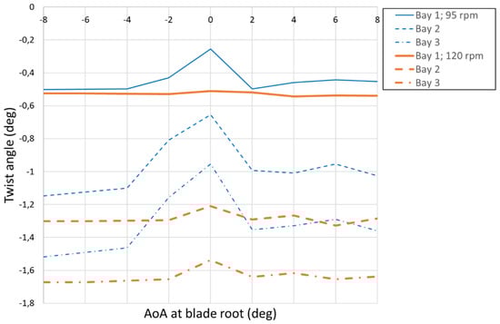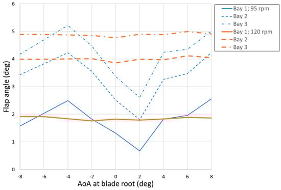 The activation of each SMA is highlighted by the sudden change of the slope of the curve, followed by a plateau that indicates the stabilization of the set temperature. The twist contribution of the actuators, 0.6° for the inner, 0.4° for the intermediate, and 0.18° for the outer bay, confirm the different magnitudes suggested by the strain measurements of the commissioning tests shown in Figure 12. Then, the twist and the flap angles achieved at 95 and 120 rpm were measured. The plots of Figure 16 and Figure 17 show these angles when all the bays are switched on, by visualizing the position of the LEDs on the tip. The twist is maximum at an angle of attack, AoA, equal to 0, while it is constant for the rest of the range. The flap angle instead shows an oscillation with two opposite peaks at AoA equal to −4 and 2 deg. The attenuation of the just mentioned excursions is remarkable at the highest speed (120 rpm) and can be explained by the centrifugal action that tends to make smoother any variation along the blade.