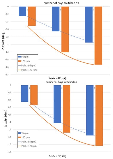 Twist angle vs. bay progressively activated at two rotational speeds (a) AoA = 0°; (b) AoA = 8°.