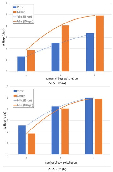 Flap angle vs. bay progressively activated at two rotational speeds (a) AoA = 0°; (b) AoA = 8°.