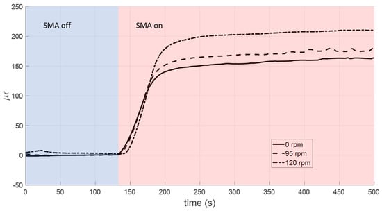 The centrifugal load has an impact also on the strain level; in Figure 20, the deformation measured by the strain gage sensor mounted at the root of the sensored plate of the 1st bay is shown against the speed. The SMA is kept initially off at room temperature for about 120 s (blue zone); then it is switched on and arrives at the full activation within few seconds (red zone). The axial action due to the centrifugal load leads to an increase of the strain of about 13 and 48 με with respect to the case at 0 speed. This qualitatively offers an idea of the strong nonlinear impact of the centrifugal action on the structural safety.