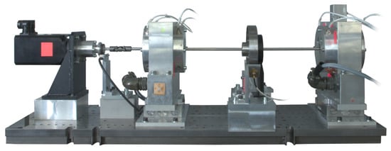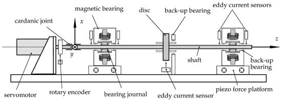 The magnetic bearing test rig at the Chair of Applied Mechanics of the Technical University of Munich is used as an example of a levitating rotor in magnetic bearings. In Figure 1, the schematic view of the magnetic bearing test rig is shown. Figure 2 shows a photo of the test rig. A control scheme of the systems is presented in Figure 3. The test rig is also described in [,]. The rotor is supported in active magnetic bearings and can be driven by a servo motor, which is coupled to the rotor via a double cardan joint. An inertia disc and two bearing journals are attached to the shaft via cone clamping elements. Back-up bearings are installed in the front and back plate of each magnetic bearing and near the disc. Displacements are measured in orthogonal transverse directions of the shaft on the front and back plate of each magnetic bearing via eddy current sensors. These sensors are used for the AMBs’ control systems and for obtaining the FRFs. Measuring the acceleration by adding acceleration sensors to the rotor shaft is not practical because the system should be able to rotate. The rotation angle is measured by a rotary encoder on the motor shaft. Compared to the test rig configuration in [], the test rig has been improved by applying additional force-torque sensors (piezo force platform Kistler 9129AA) underneath the magnetic bearings. They give an accurate reading of the magnetic bearing ground force, which corresponds to the total force of the bearing. This information is used later for a validation of total bearing force estimated from the AMB signals.