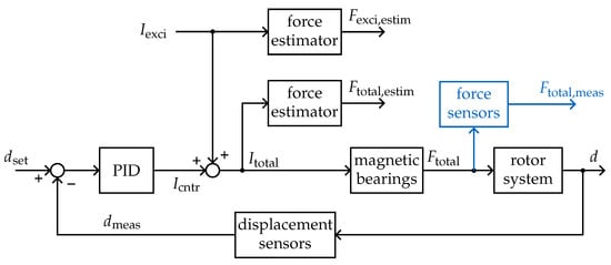 - Estimating the force from a more comprehensive model using the electrical current. This can be a model which has been parameterized experimentally or which used theoretical knowledge about the AMBs from an electromagnetic simulation model.One way is to directly measure the current. Current measurement is much cheaper and more easily available than, for example, force measurement.Another way is to estimate the current from the controller’s output. The electrical current is not measured, but guessed from the control system’s desired values. This is the method used in this work. It is assumed that the behavior of the electrical system is ideal, i.e., a desired current is perfectly executed. Here, the force is estimated using a linear static current–force relationship, given in Equation (5).