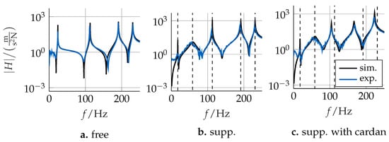 Parametrization of the simulation model by comparison with FRF-results for impact testing with different system setups. The eigenfrequencies of the supported system without the cardanic joint (b) are marked by dashed lines to highlight the difference between the system without (b) and with (c) the cardanic joint.