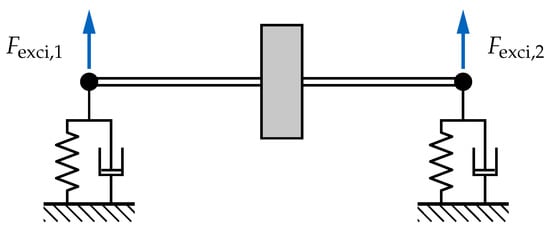 In this contribution, the FRFs of the free and supported rotor can be measured simultaneously with one setup that is suitable for practical applications, see also Section 2.4. The excitation is applied via the bearings, using an additional excitation current that is added to the AMBs’ controller currents. The combination of the excitation and bearing task in the magnetic bearing enables us to measure the FRFs of different theoretical system configurations in a single experiment by considering different force signals, which has not been shown in the literature. The basic idea can be summarized as follows: Considering only the excitation force, which is a perturbation added to the controlled bearing force, the FRF of the supported rotor is obtained. Considering the total force, namely, the sum of contributions from the controller and from the additional excitation, gives the FRF of the free rotor. Here, we want to use a simple implementation of a standard MIMO excitation signal, e.g., burst random excitation, which can be found in text books about EMA, for example, in [] (p. 323ff). We also want to give an intuitive interpretation of the results to understand how AMBs can be used to obtain different FRFs of one system in a single experiment.