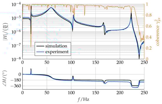 Figure 6 shows the experimental results for the FRF using only the additional excitation force and compares them with the results from the numerical simulation for the rotor in elastic bearings. It shows the FRF between excitation at the right AMB and the response at the rightmost eddy current sensor. The excitation and response positions are very close, so a behavior similar to a driving point FRF is expected. The experimental and simulation results are clearly similar. The coherence of the experimental FRF is shown in orange. It starts to fall at around 200 Hz because a band-limited noise with a cut-off frequency of 250 Hz was used in the burst random excitation.