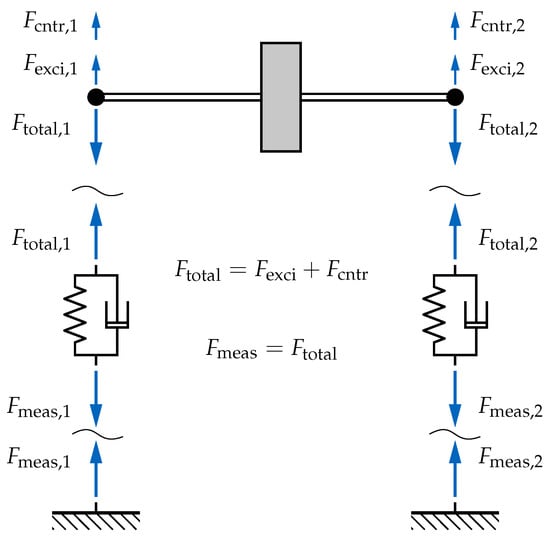 The total force is estimated from Equation (5) and measured by the force platforms. It is the force that acts between the ground and the magnetic bearings. It includes the additional excitation force and the controller force. The controller force can be seen as the reaction force of the bearings. It is now assumed to be part of the external excitation and the bearings are therefore no longer part of the characterized system. So, only the rotor without the bearings remains, i.e., the free rotor: