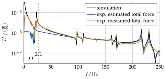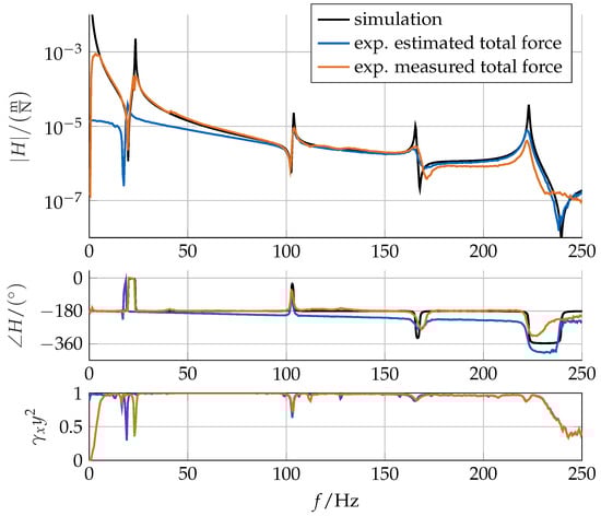 Figure 8 shows the results for the experimental FRF using the total force between the right magnetic bearing and the rightmost eddy current sensor. It shows the amplitude and phase of and its coherence for the experimental results. This experimental FRF is obtained by using signals from the same experiment that was also described previously in Section 3.1. The curves exp. measured total force use the force that is directly measured by the force platforms . The curves exp. estimated force use the force that is estimated from the total electric current . It is compared to the simulation results for the free rotor system.